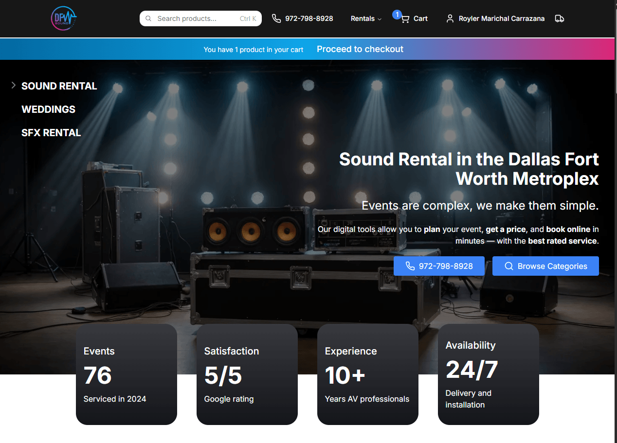 DFW Sound Rental has transformed the AV equipment rental industry in the Dallas Fort Worth Metroplex with their innovative digital platform that makes complex events simple. Built as a comprehensive e-commerce solution, the platform allows event planners, wedding organizers, and corporate clients to browse, configure, and book professional audio-visual equipment with unprecedented ease.