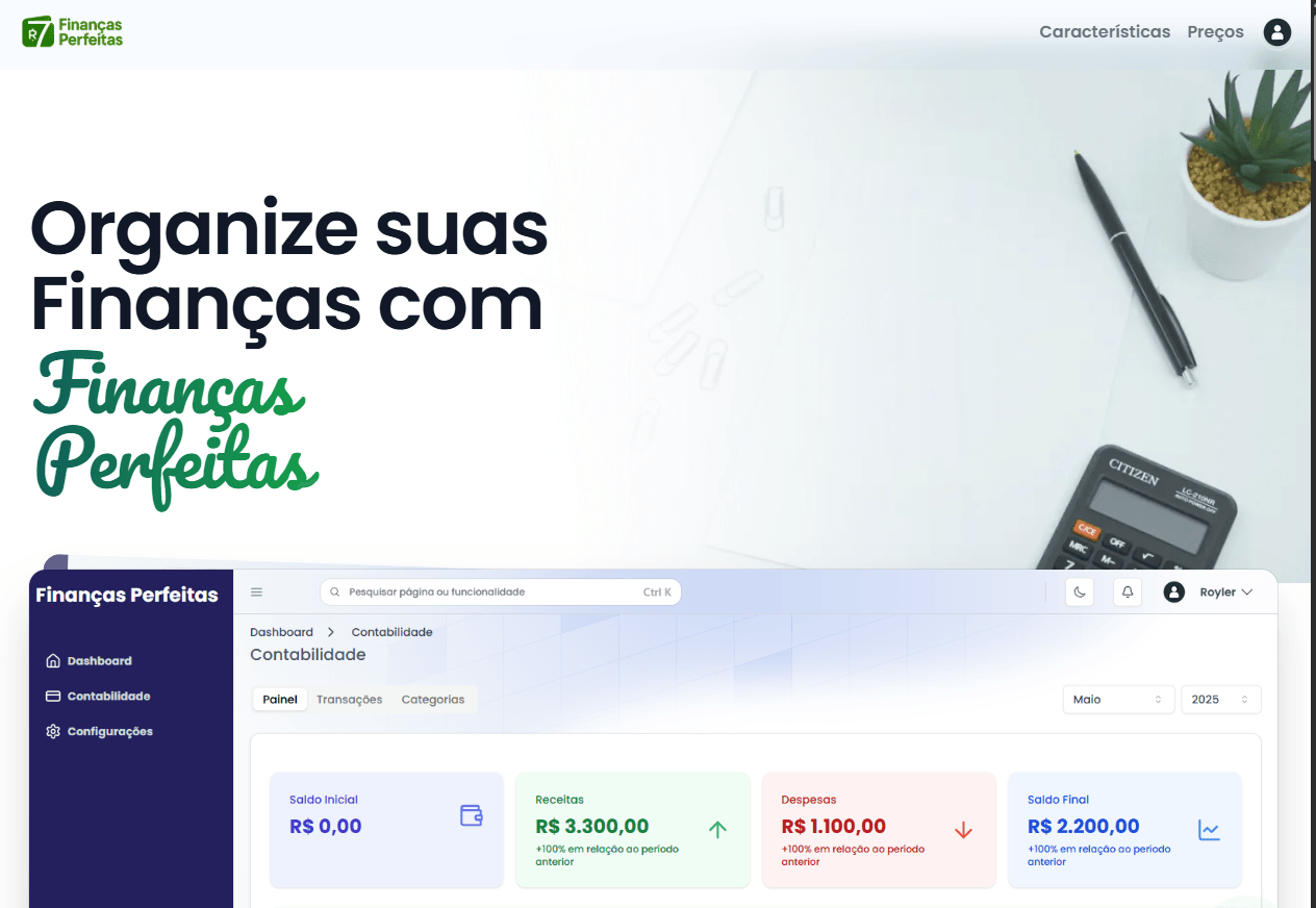 O Finanças Perfeitas é um sistema completo desenvolvido para gestão financeira pessoal e familiar, oferecendo uma solução intuitiva para organizar receitas, despesas e controlar as finanças de forma eficiente. A plataforma foi construída com tecnologias modernas, proporcionando uma experiência fluida e confiável para os usuários.